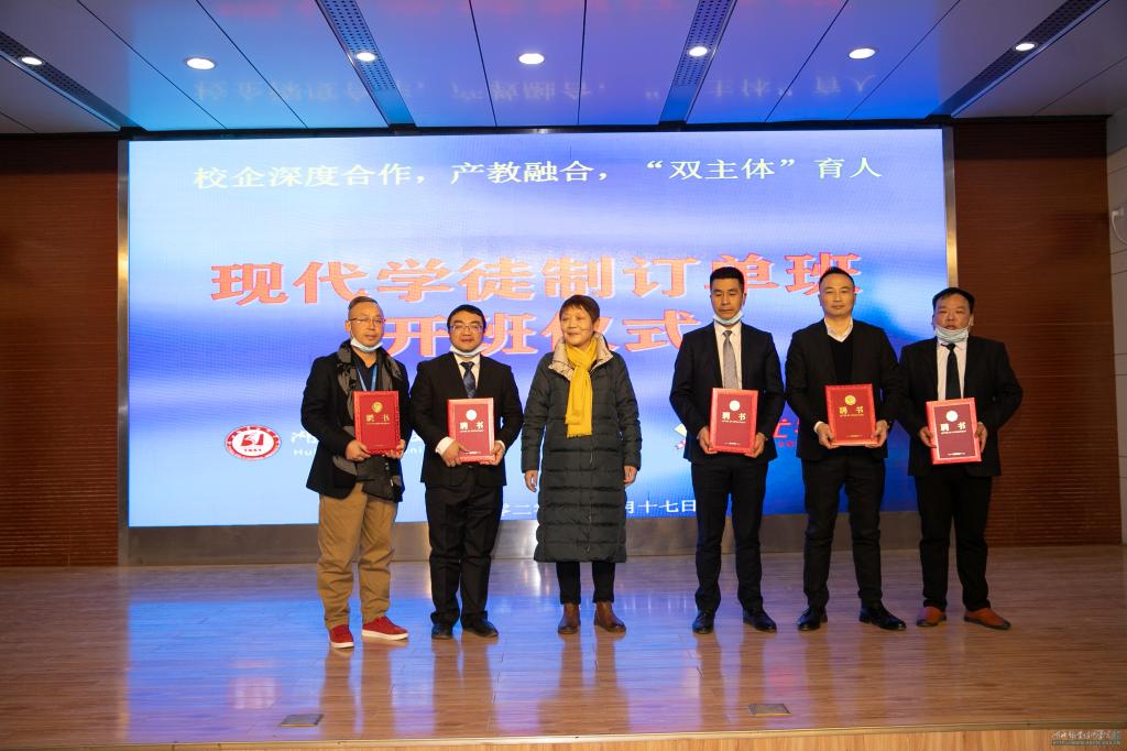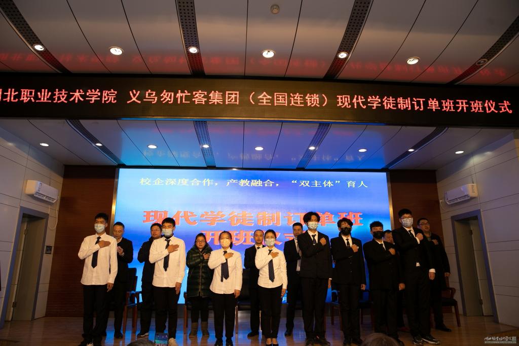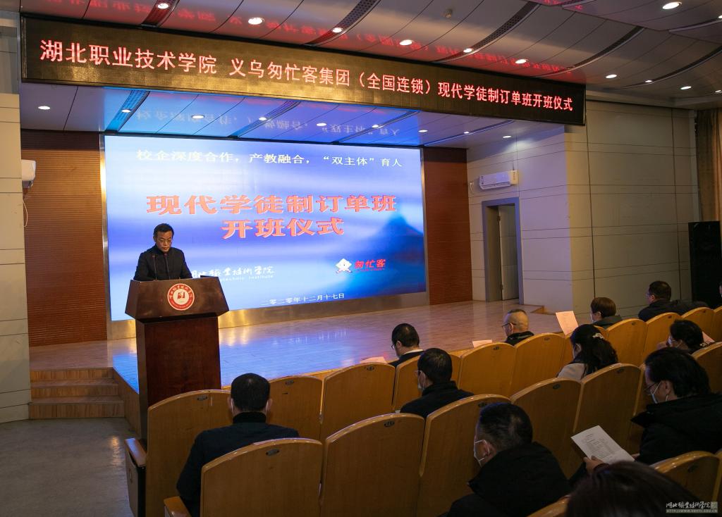 开班仪式上,学校副校长梅重、义乌匆忙客集团人力资源副总经理贺红兵分别致辞,pg电子官方网站院长徐斌华介绍了订单班相关情况,校长朱虹向匆忙客集团相关同志颁发了客座教授聘书,匆忙客集团盛等财副总经理向学校教师发放企业管理顾问聘书,举行了拜师礼等。