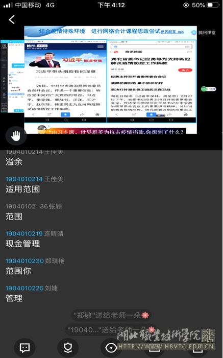2020年3月7日下午,pg电子官方网站组织教研室主任和会计教研室全体教师进入周雪艳老师的腾讯课堂,听取了周老师的线上教学课程《初级会计实务》,并在听课后进行了qq视频集体评课,教务处处长黄享苟、督导处周文老师全程参加了听课和评课活动。
