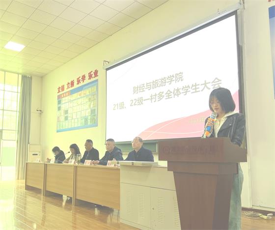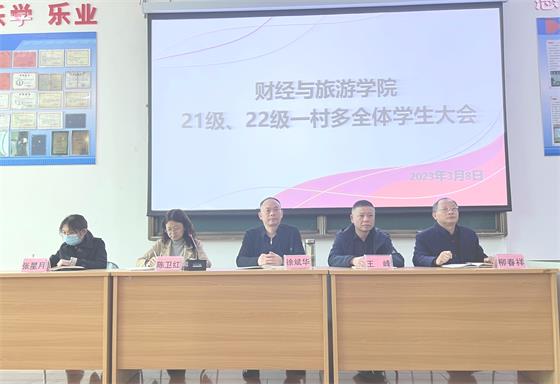 2023年3月8日下午,财经与旅游学院在文华楼文昌大讲堂召开21、22级“一村多”全体学生大会。院长徐斌华率学院学生管理团队参加了活动,会议由分管学生工作的副院长陈卫红主持。
