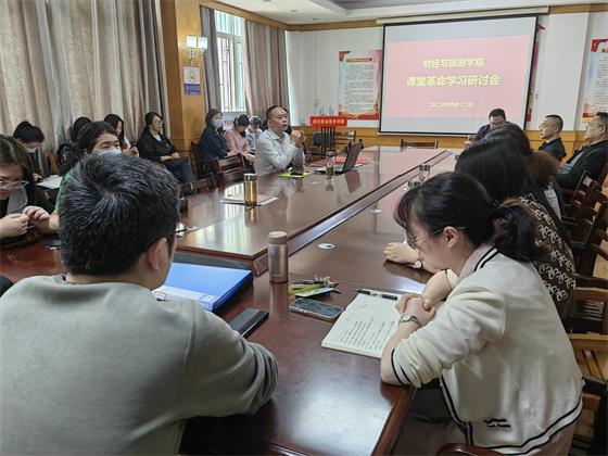 为全面贯彻学校第三次党代会精神,进一步落实2023年全校教职工大会上提出的“五个突破”工作要求,切实提高课堂活力和教学实效,4月12日下午,财经与旅游学院在西区文华楼2楼会议室开展“课堂革命”学习研讨会。会议由财经与旅游学院院长徐斌华主持,学院全体教职工参加。