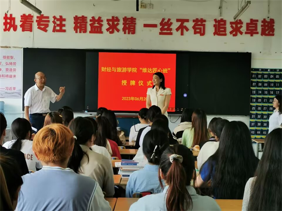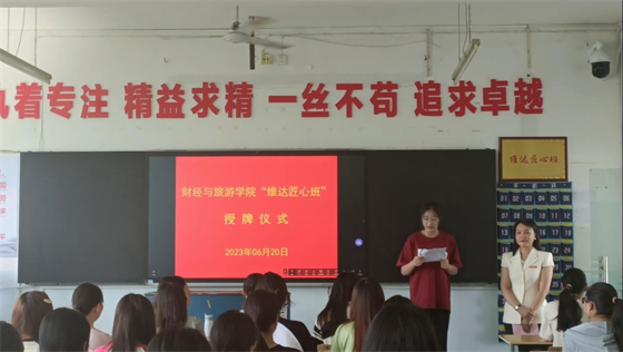 6月20日上午,财经与旅游学院在文华楼院22040102班举行“维达匠心班”授牌仪式。全国“五一”劳动奖章获得者杨晶、院党总支书记罗安文、副院长陈卫红、教学办主任刘爱华、辅导员黄曙光及全班同学参加了授牌仪式,会议由罗安文书记主持。