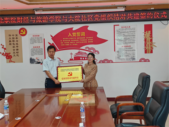 为深入贯彻落实党的二十大精神,积极发挥基层党组织的引领带动作用,进一步搭建学院和社区的交流平台,探索和创新党建工作模式,构建“资源共享、优势互补、互相促进、共同提高”的党建工作新格局。6月26日下午,财经与旅游学院学工党支部与孝南区广场街道大院社区居委会支部“结对共建”签约授牌仪式在大院社区党员会议室隆重举行。大院社区党委书记杨耀华、居委会社区支部书记颜倩、财经与旅游学院党总支书记罗安文、学工支部书记陈卫红及两个支部的部分党员参加了签约授牌仪式。