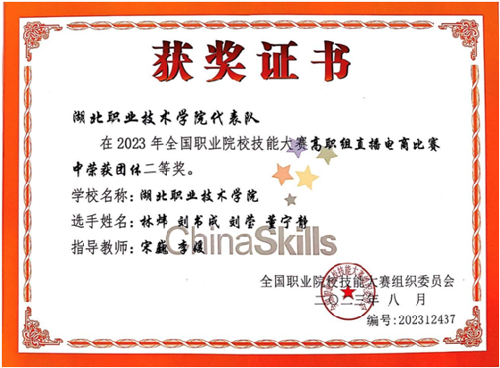 8月23日至25日,2023年全国职业院校技能大赛高职组·直播电商赛项(团体)在浙江义乌工商职业技术学院举行,来自全国的78支代表队参加了本次大赛。我校财经与旅游学院林炜、刘书成、刘莹、董宁静4名同学代表湖北省参赛,荣获团体二等奖。