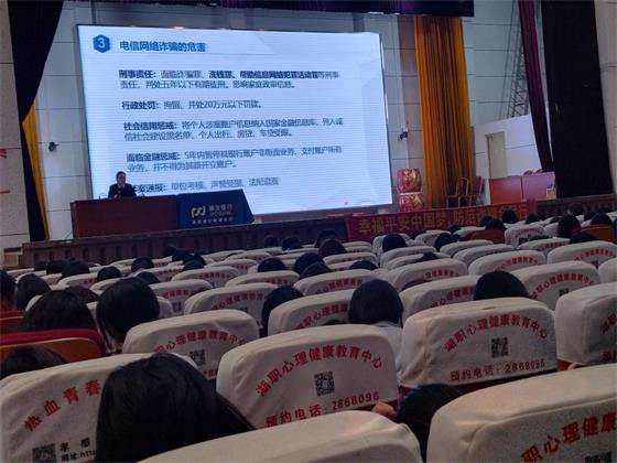 浦发银行孝感分行零售业务部总经理王佩从我国和孝感电信诈骗的总体情况谈起,教育引导广大学生深刻认识电信诈骗的危害,并向学生普及《中华人民共和国反电信网络诈骗法》、《中华人民共和国反洗钱法》等相关的法律法规,教育学生远离电信网络诈骗。王佩总经理结合现实生活中学生受骗的情况,列举了大量真实的诈骗案例,并以自身曾经受骗的经历,讲述了诈骗犯利用微信、QQ冒充熟人好友诈骗、利用网络游戏装备及游戏币交易实施诈骗、网购刷单诈骗等实施诈骗的过程,并针对各诈骗手段给出了有效的应对策略和防诈骗措施。王佩总经理告诫同学们面对网络电信诈骗要坚持“五不一打”原则,即积分兑换现金不要贪、不明短信链接不要点、虚假转账指令不要信、未经核实资金不要转、冒充公检法警不要怕;发现被骗立即拨打报警电话等,强调要牢记“十个凡是”。讲座过程中设计了“有奖竞答”,与学生互动,极大地调动了学生参与学习防诈骗知识和方法的积极性。