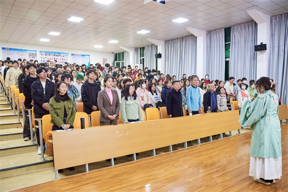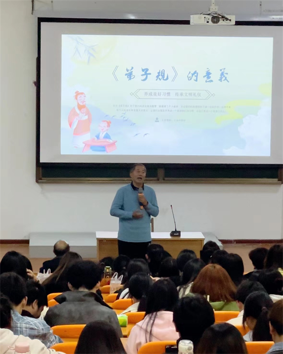 在古朴典雅的音乐声中,罗安文书记介绍国学的智慧和魅力,并宣布我院国学课堂正式启动。他嘱托学子通过学国学成为善良博爱,乐观豁达,自信勇敢的时代新青年;陈卫红副院长宣读国学教育方案,对学院国学教育活动进行部署和安排;拜师仪式中,王水华教授对学生代表进行衣冠整理,并进行亲切地问候;五位学生代表朗诵《弟子规》,两位老师代表朗诵《朱子治家格言》,让全场沉浸在国学的无限魅力当中;王水华老师对《弟子规》进行了深入解读,结合现代社会实际,在与学生的互动中详细阐述了《弟子规》中关于孝道、礼仪、学习和处世的智慧,使师生们对国学经典著作有了更加全面和深刻的理解。最后,全体学生齐读《大学》为此次活动拉上了帷幕。