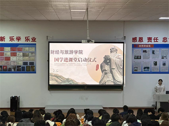 为弘扬国学文化,丰富学生精神世界,涵养学生人文品行,3月28日晚上,财经与旅游学院在文华楼阶梯教室举办了“国学课堂”启动仪式。湖北宏阳新型建材股份有限公司董事长王水华、湖北宏阳新型建材股份有限公司总经理王珍、孝昌宏阳水泥有限公司总经理王望芬、学校原工会主席张占华教授、财经与旅游学院党总支书记罗安文、学工副院长陈卫红、全体辅导员及300余名学生代表等参加了启动仪式。