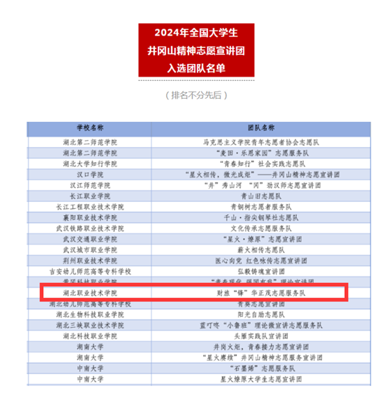 为深入学习宣传贯彻习近平新时代中国特色社会主义思想和党的二十大精神,落实“强国复兴有我”群众性主题宣传教育活动相关要求,引导动员青年学生大力弘扬井冈山精神,团中央青年志愿者行动指导中心、全国青少年井冈山革命传统教育基地管理中心近日联合开展了2024年全国大学生井冈山精神宣讲团遴选活动。财经与旅游学院财旅“锋”华正茂志愿服务队成功入选。