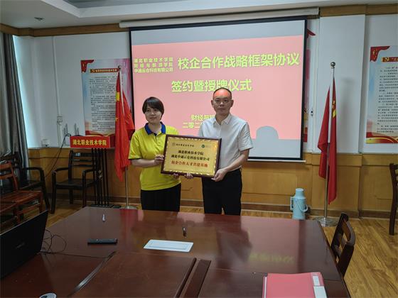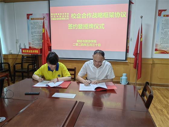 在热烈的掌声中,徐斌华院长和周燕经理代表校企双方正式签订校企合作协议,并进行了校企合作授牌,后续将在学校和企业分别悬挂“校企合作人才共建基地”字样的牌匾。