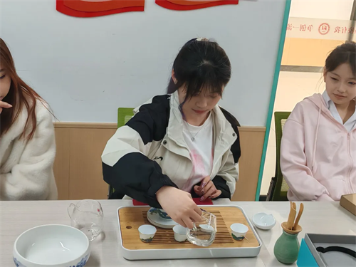 同学们积极参与体验,在实践中亲手泡茶、奉茶,见证了茶叶在水中舒展、茶汤逐渐金黄透亮的奇妙变化,也体悟到泡茶时专注当下的心境。在郭柯颖同学的耐心指导下,同学们认真学习温杯、置茶、冲泡、奉茶等步骤,一招一式都学得有模有样,专注于每一个细节,力求将茶汤的色香味展现到最佳状态。小小的一杯茶,已然超越饮品范畴,成为同学们修身养性、提升文化素养的独特媒介。