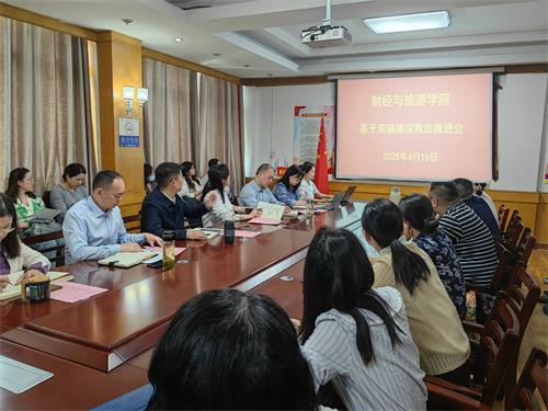 4月16日下午,财经与旅游学院召开基于双链路深教改专题推进会,校长郭沙莅临指导,全体教师参加会议。