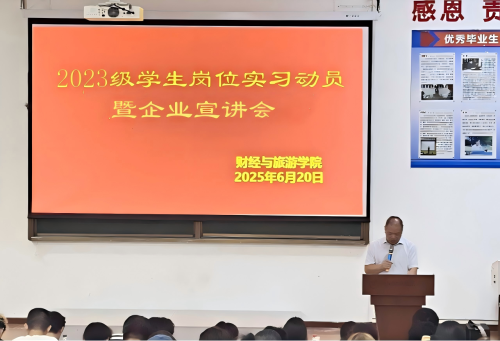 为有序推进财经与旅游学院岗位实习工作,助力学生实现从校园到职场的平滑过渡,学院于2025年 6月20日召开了2025年学生岗位实习动员暨企业宣讲会。学院副院长汪行光、陈卫红、学工办主任王峰、辅导员高晓茹等以及来自跨境电商集团、电商物流企业、文化传媒公司、文旅产业、高星级酒店等近20家合作企业人力资源经理出席活动,与300多名即将踏上实习岗位的学生面对面交流。活动通过政策解读、企业宣讲、互动答疑、现场面试等环节,为学生搭建起职业发展的“双向桥梁”。