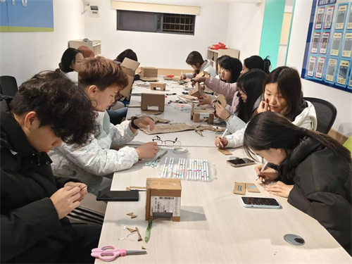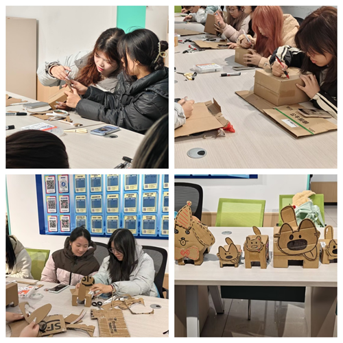 活动现场,废纸盒、剪刀、彩笔等工具一应俱全,同学们围坐在一起各抒己见,分工明确,有的负责绘制,有的负责裁剪,还有的同学专注于装饰……普通的纸盒也就变得“时尚”起来。一堆普通的纸盒摇身一变成为一只只活灵活现的狗狗,憨态可掬,古灵精怪,每一只都独一无二,它们承载着同学们的奇思妙想,也附着着浓浓的同学情。