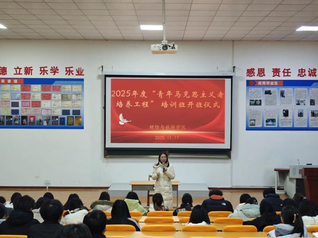 为深入贯彻落实习近平新时代中国特色社会主义思想和党的二十届四中全会精神,进一步深化学习“青年马克思主义者培养工程”关于青年工作的重要论述,激励广大团员青年坚定马克思主义信仰,塑造一批素质高、能力强、肯干事的团学骨干队伍,11月17日,财经与旅游学院在文华楼阶梯教室举办了2025年度“青年马克思主义者培养工程”培训班的开班仪式暨第一讲。学院副院长张星月、各年级辅导员老师、青马培训班学员和部分学生代表参加开班仪式,开班仪式由团总支书记祝非凡主持。