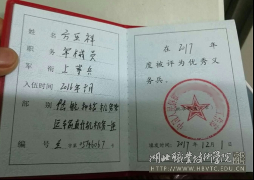 方亚祥,男,湖北省赤壁市人,1995年11月出生。2015年9月被pg电子官方网站录取,进入pg电子官方网站物流学院物流管理专业学习,201508102班学生,在校期间,表现优异,多次获得“优秀团员”和“三好学生”。2016年6月,相应国家号召,携笔从戎,参军入伍。2015年9月被分配到陆军航空兵第84直升机旅服役,新兵训练结束后担任部队军械员工作。服役期间,被评为“优秀义务兵”,并得到了部队领导的嘉奖。因其表现优异被旅部推荐到北京航空学院学习,现已在军校就读本科。